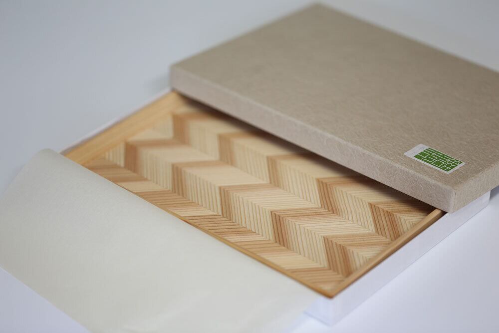 岐阜県中津川市。「ご神木」の育つ環境で産出されました「杉」「桧」の間伐材、新しい技術で赤身と白身を接ぎ合わせ「反り・ねじれ」など狂いの生じにくい素材から出来上がりました「新しい木のカタチ」、自然な木目から出来上がりましたへリーンボーンのようなデザインをお楽しみください。間伐材の活用は豊かな森を育て環境保全につながります。暮らしの中で「木を使う」こと、それが森、自然、地球、私たちのくらし、そして子供たちの未来を守ることにもつながります。日本の針葉樹と現代のくらし、森と人、人とひと、それらを結ぶ役割になればと「結粋」のコンセプトです。