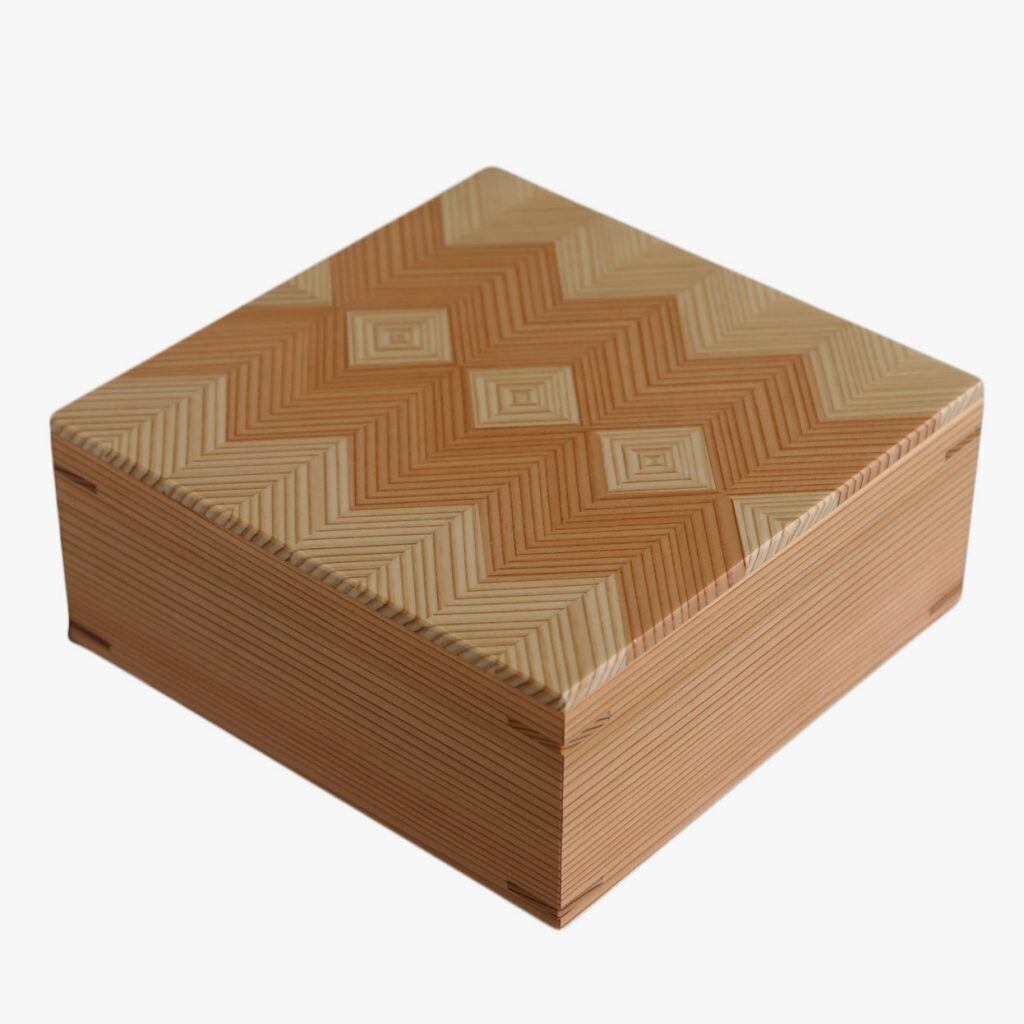 地元の木材を活用し製作した蓋は、テキスタイルのように美しくやわらかな杉の木を織り込んだ新しい木のカタチ。杉の色彩豊かな木目のデザインは食卓を楽しくスタイリッシュにしてくれます。