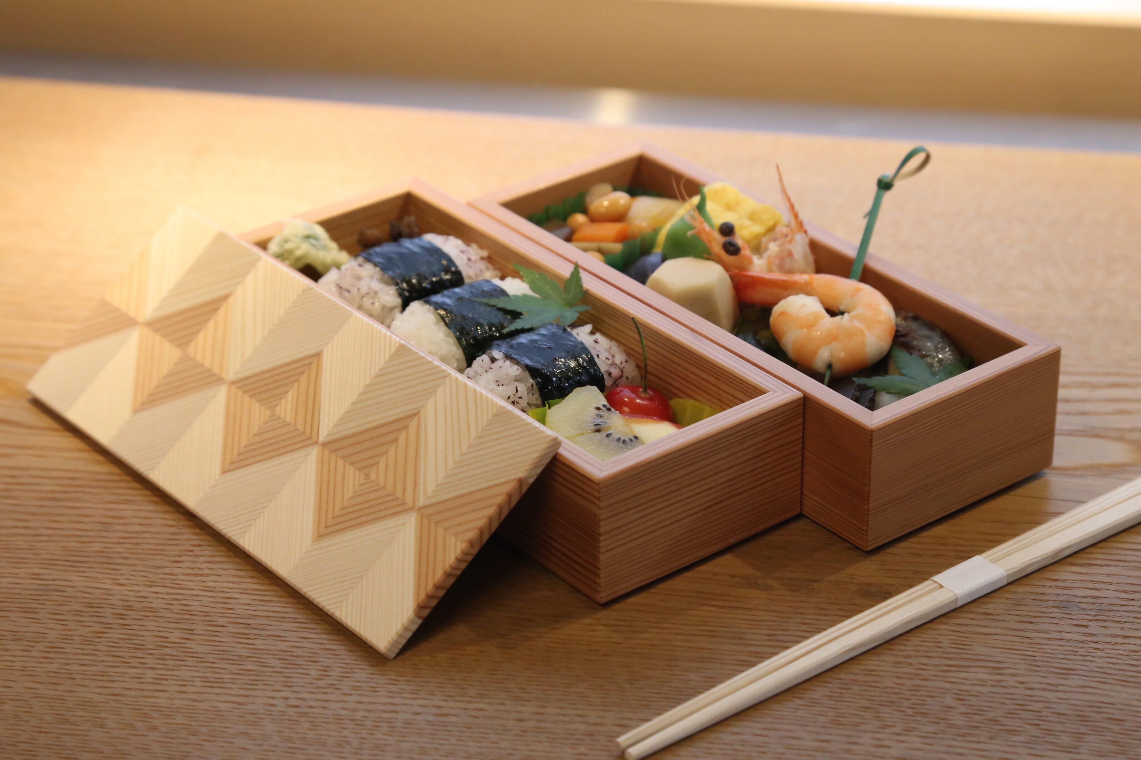 「結粋」のお弁当箱は水分を吸収するため冷めても美味しく「ふっくらご飯」の味わいを杉の木のほのかな香りとともにお楽しみいただけます。