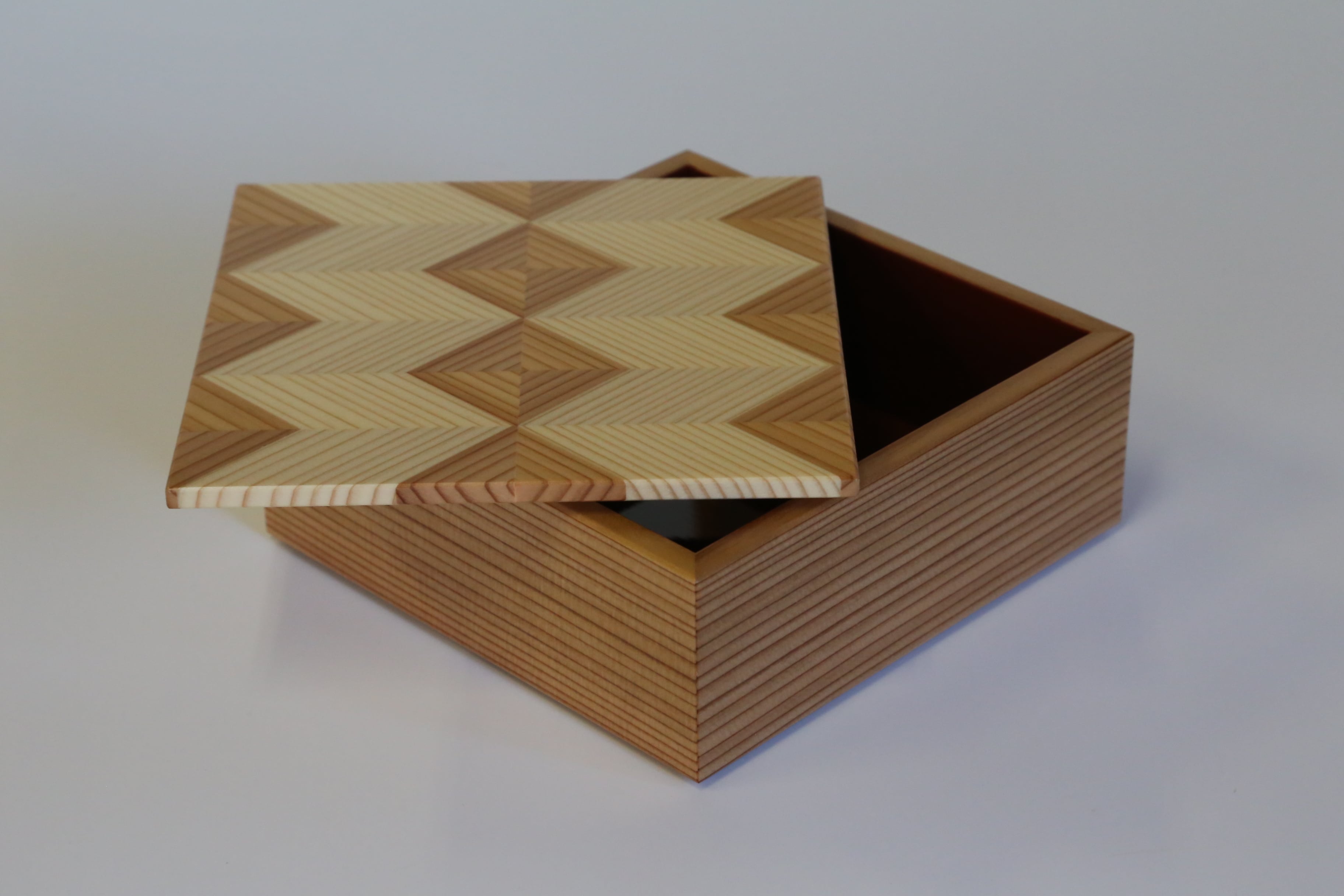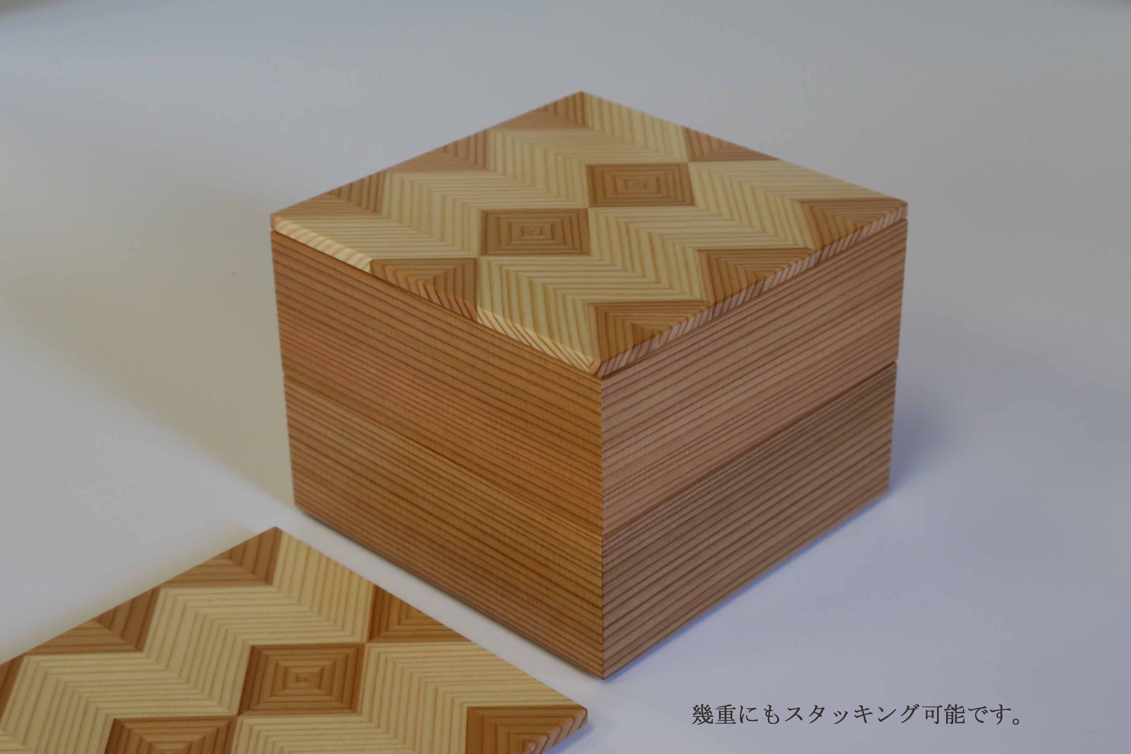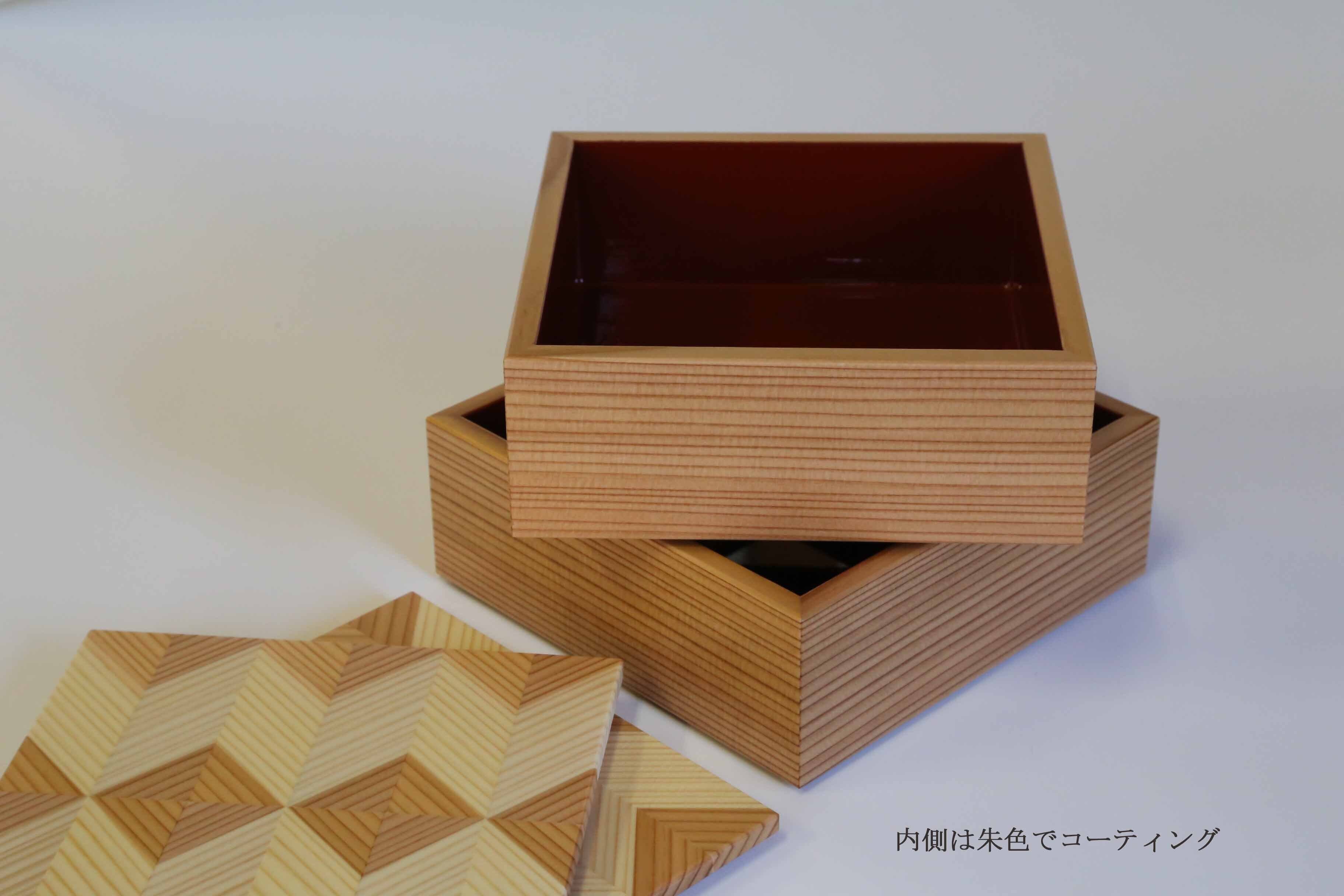 「結粋」のお弁当箱は地元の木材を活用し製作した蓋は、テキスタイルのように美しくやわらかな杉の木を織り込んだ新しい木のカタチ。杉の色彩豊かな木目のデザインは食卓を楽しくスタイリッシュにしてくれます。内側は朱色でお料理がより一層美しく盛り付けることができます。また幾重にもスタッキングでき便利なお重です。ピクニックや運動会などのお弁当箱に、また菓子器としても様々なシーンにお使いいただけます。