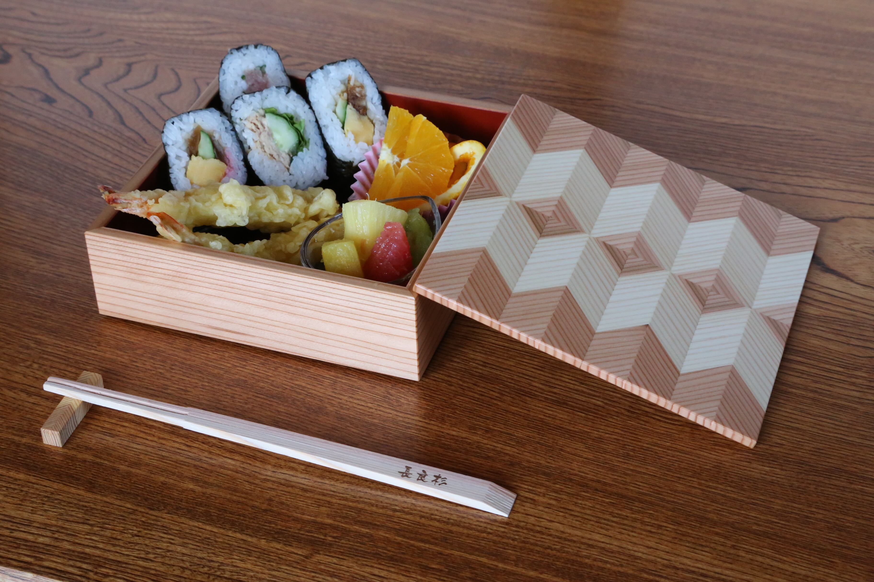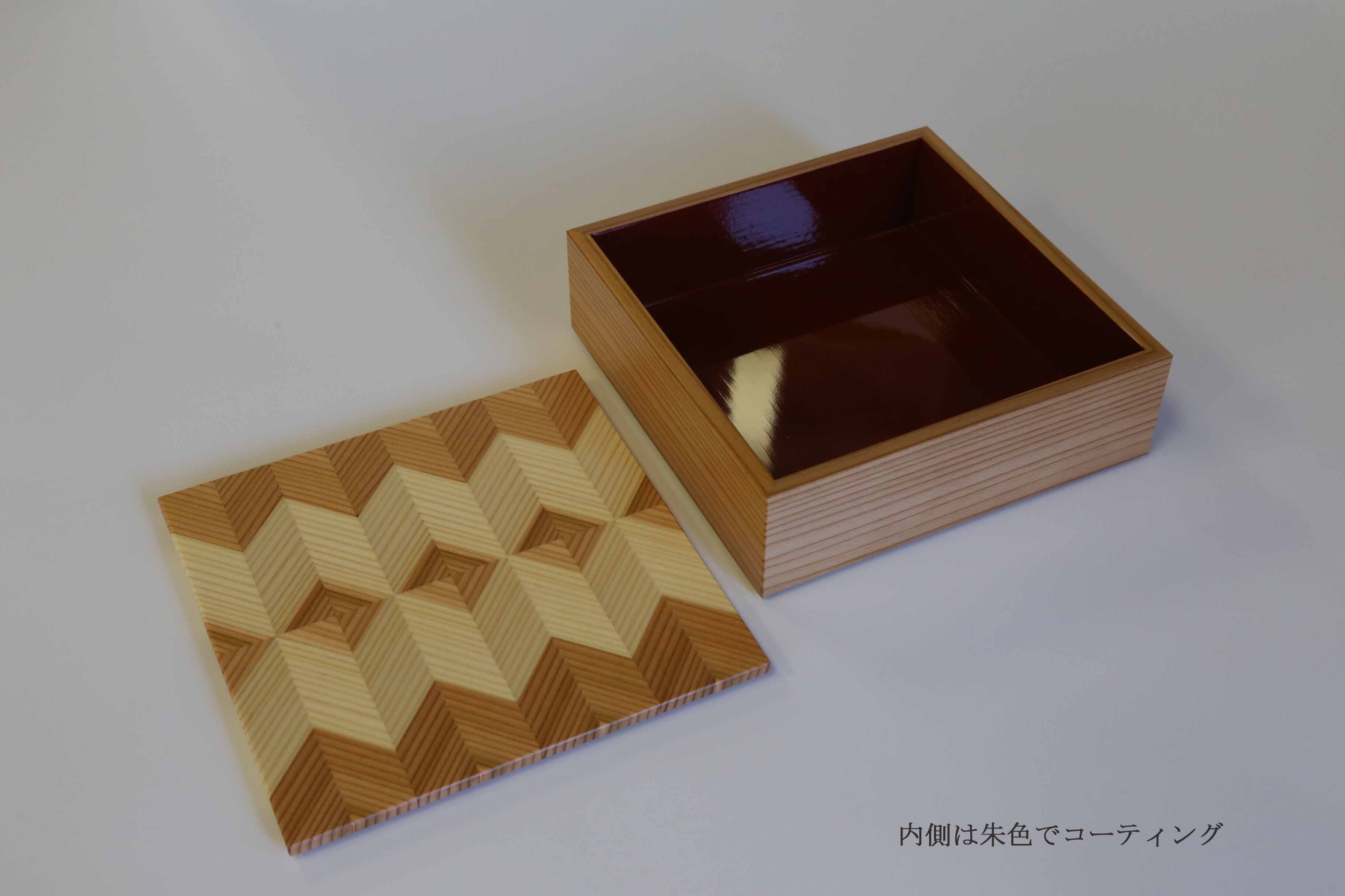 「結粋」のお弁当箱は地元の木材を活用し製作した蓋は、テキスタイルのように美しくやわらかな杉の木を織り込んだ新しい木のカタチ。杉の色彩豊かな木目のデザインは食卓を楽しくスタイリッシュにしてくれます。内側は朱色でお料理がより一層美しく盛り付けることができます。また幾重にもスタッキングでき便利なお重です。ピクニックや運動会などのお弁当箱に、「おせち料理箱」としても様々なシーンにお使いいただけます。